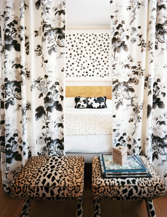 This is a beautiful, daring room. This is proof that mixing patterns work SO well when doneto the right scale. (I didn’t mean for the word ‘so’ to be that big, I just wanted a little emphasis. There was no shouting involved when writing this.) It also proves that balance is a must for a peaceful space. The pair of leopard stools with that drapery and photo hanging right in the middle is executed just right.