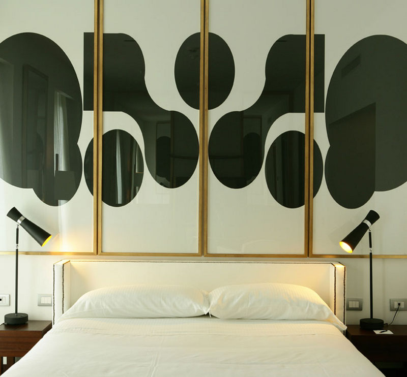This is a pretty classic and traditional use of symmetry. It’s simple- place a lamp on either side of the console table. It’s the color combination of the black&white with the yellow that makes it interesting. Plus the fact that there’s a giant cockatoo leaning on the wall, whatever.