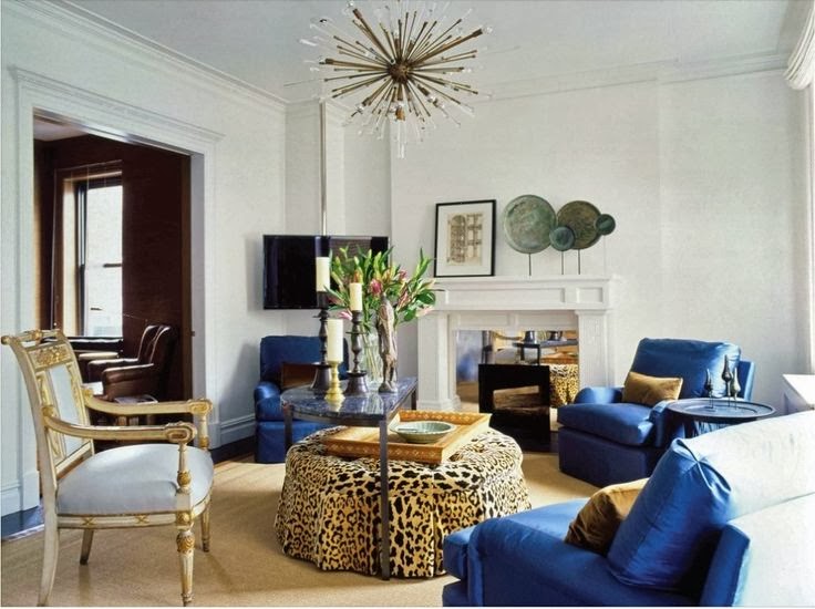 This is what their shared space would look like. This room is very traditional for the most part but feels current because of the color choices. The neoclassic chair, the skirted ottoman and plush chairs would usually feel dated in other surroundings but with the chandelier and the dark painted side room this space feels modern.