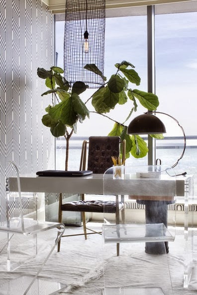 This would be where she finds solitude and gets some work done. The form of the fiddle leaf tree in the background is so beautiful and I love how the lamp mimics that shape. The black and brass chair grounds the corner with the Lucite chairs and white cowhides. Then there’s the wallpaper and light fixture. The wallpaper is awesome and I’m still not sure how I feel about that caged light bulb. A part of me thinks it’s beautiful and the other part tells me I should try and help.